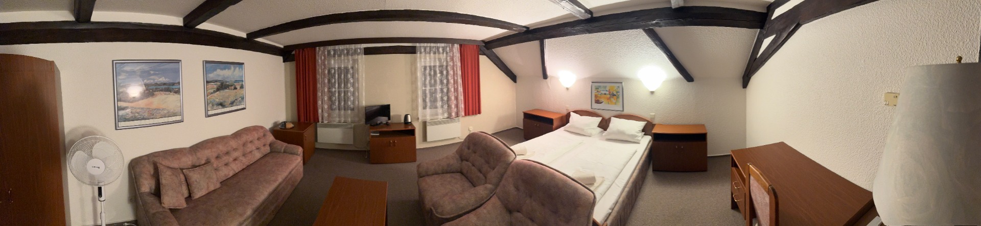 Vybavení: Tři jednolůžka, pohovka, psací stůl, televize, lednice, koupelna (sprchový kout, WC), el. topení s prostorovým termostatem, Wifi, větrák, rychlovarná konvice